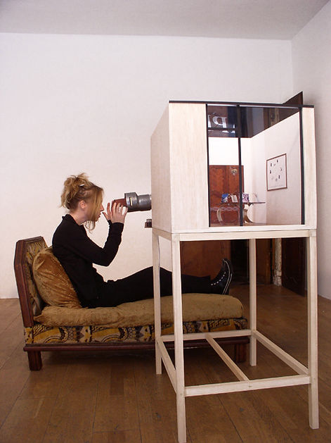 L’autre extrémité se termine par un appareil d’optique “un stéréoscope”, où le regard du spectateur (allongé sur une méridienne - référence à la psychanalyse), vient se plonger dans un univers mental, virtuel où se mêlent des performances dites “sociales”.